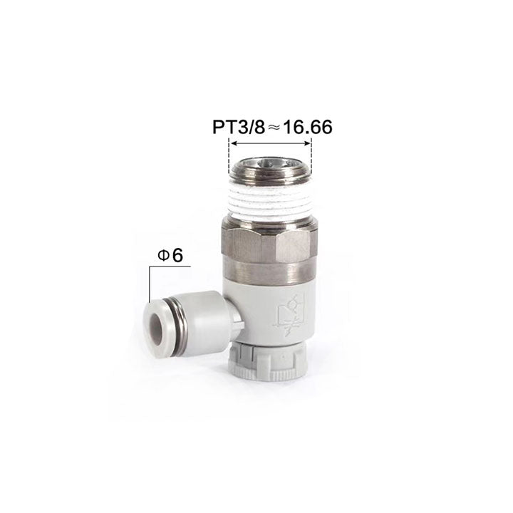 Specifications: push-lock speed control valve,Nozzle caliber: ø6mm,Connection thread: PT3/8,Throttling mode: exhaust throttle type,Color: black (interface: black/body: black),Tooth type: PT tooth,Material: SUS304,