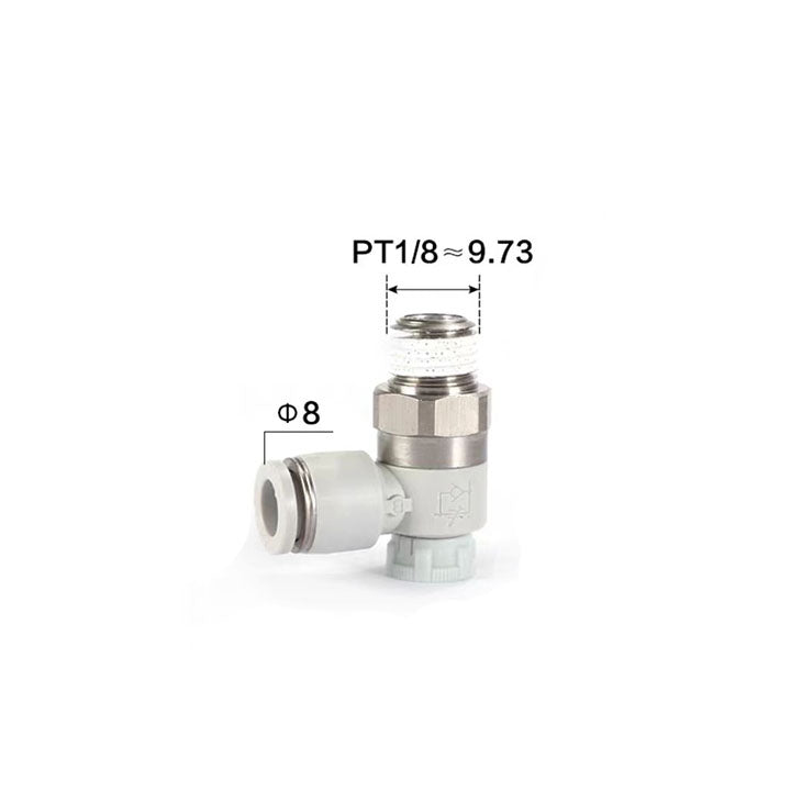 Specifications: push-lock speed control valve,Nozzle caliber: ø8mm,Connection thread: PT1/8,Throttling mode: intake throttle type,Color: black (interface: black/body: black),Tooth type: PT tooth,Material: SUS304,